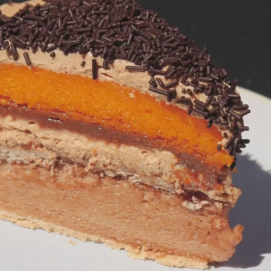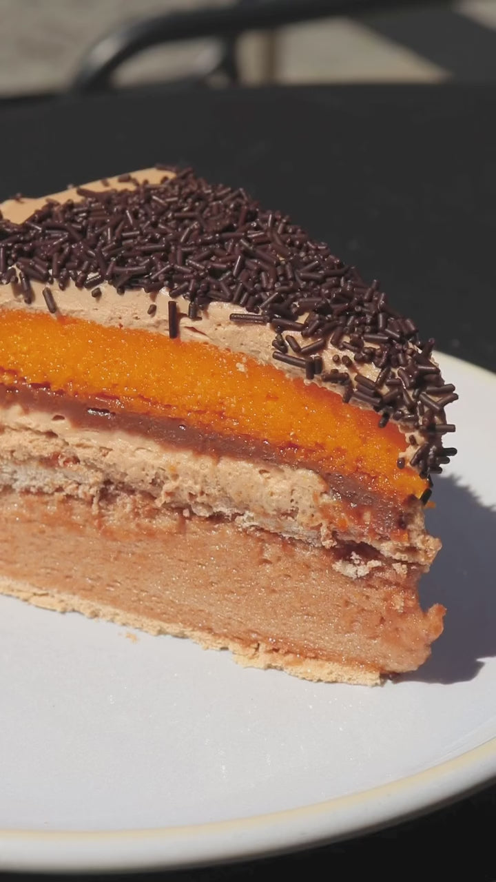 Ingredientes: base de merengue de chocolate, brigadeiro de chocolate, bolo de cenoura, mousse de chocolate e decorado com granulado de chocolate de leite.